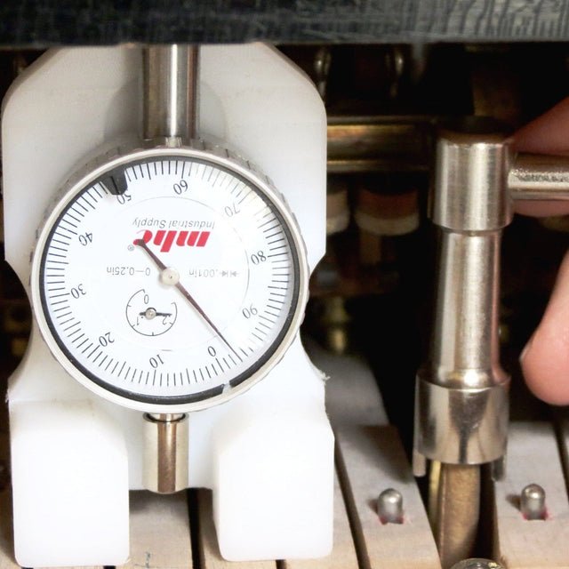 The WNG Keyframe Bedding Tool houses a dial indicator, which reads out the distance between the key button it sits on and the pinblock above. It sensitively detects a change when glide bolt or nearby keypin are lightly pressed, if the stud does not touch the keybed. Grandwork Bedding Protocol included for free.